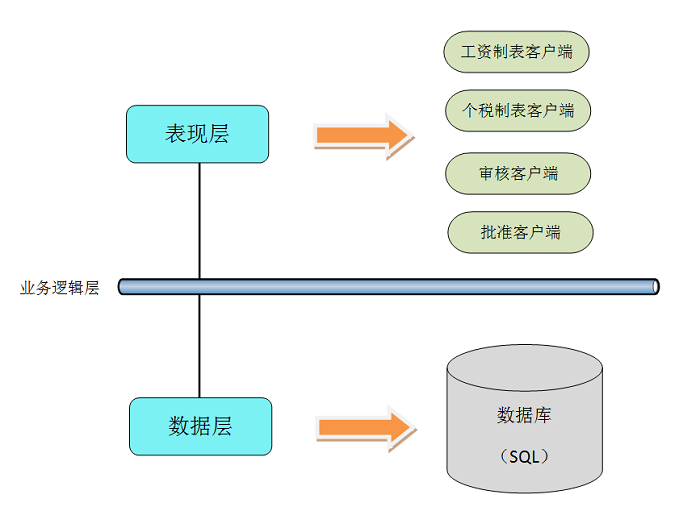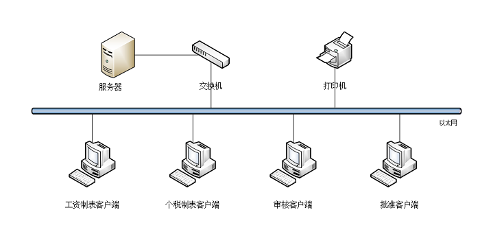 整個系統分數據、管理及中間業務邏輯三層結構,服務器上運行系統數據庫軟件,存儲所有相關的數據信息,在各客戶端運行工資管理系統軟件。同時連接打印機可打印報表。